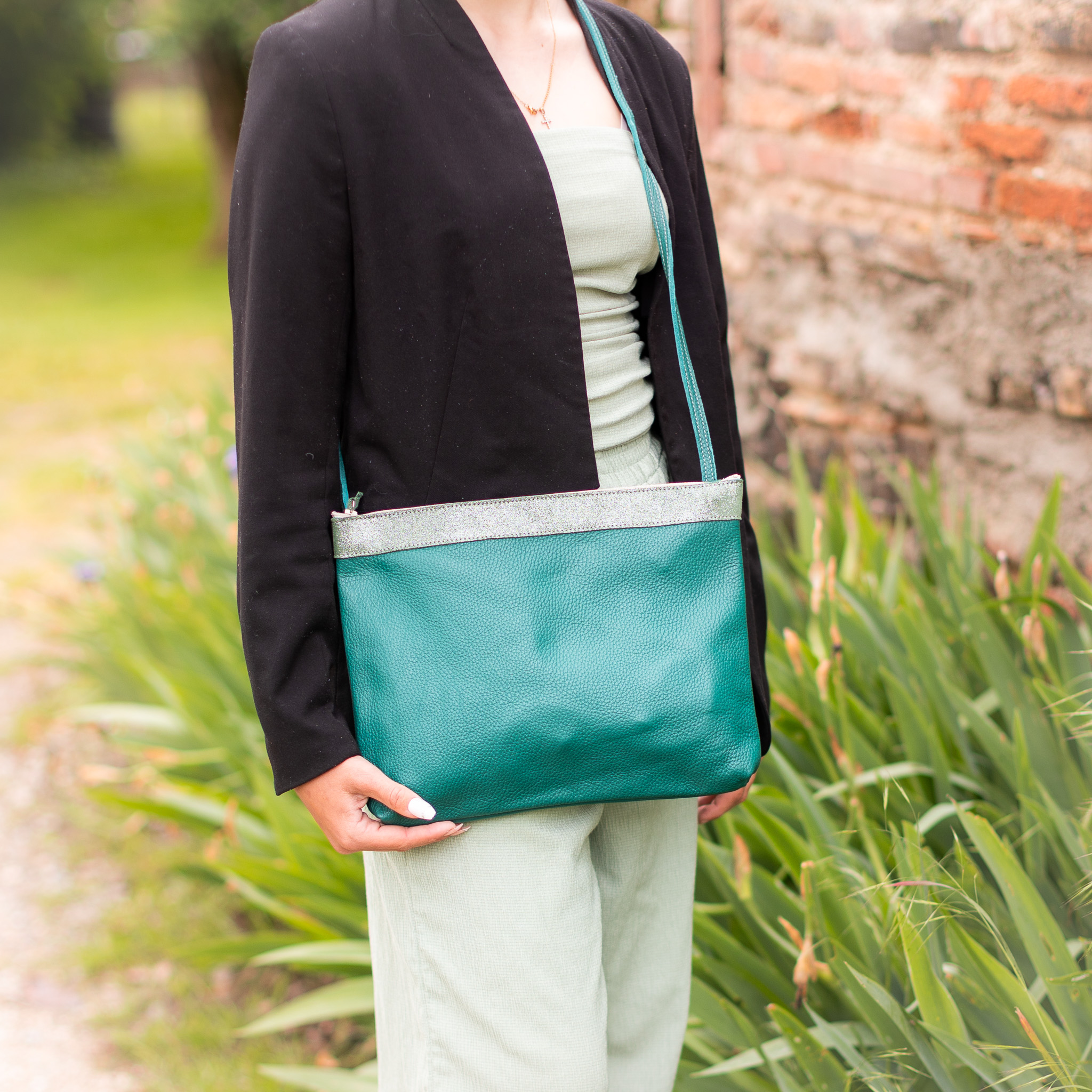 Découvrez notre Maxi Sac Neptune, un sac simple mais pas moins élégant, principalement en cuir grainé, et avec sa touche de cuir pailleté pour sa touche de féminité.