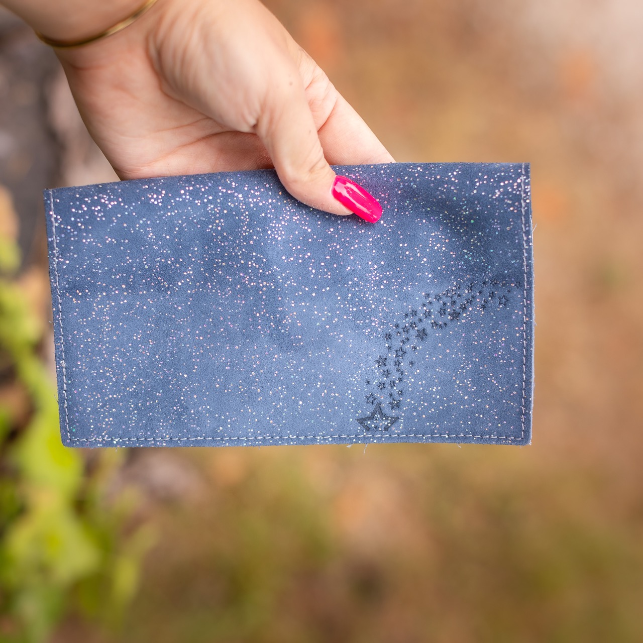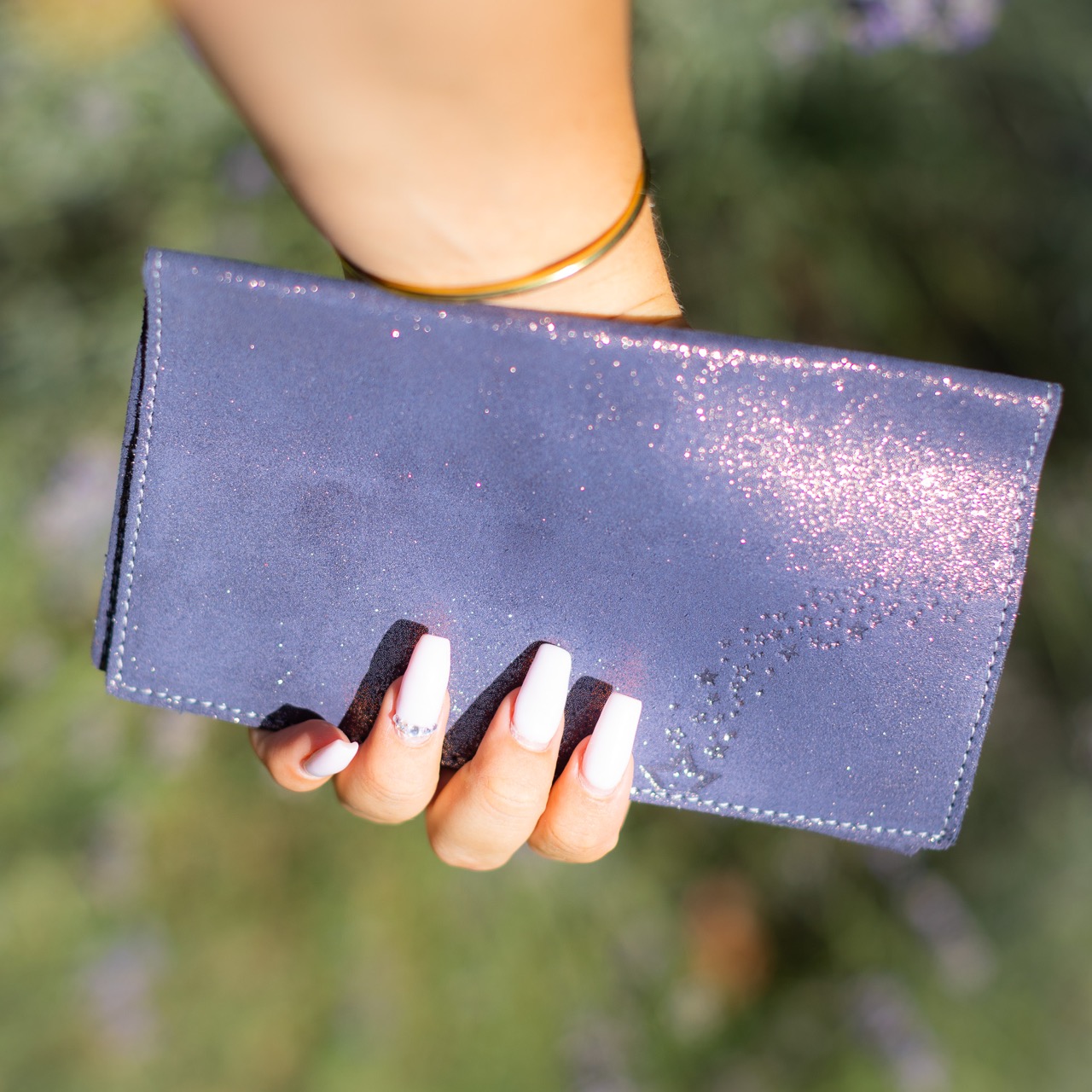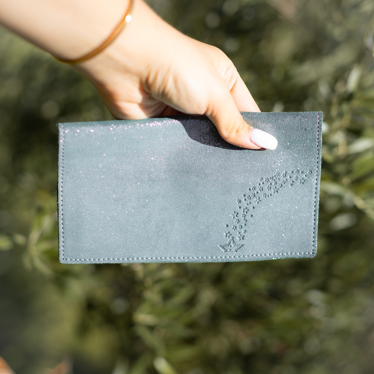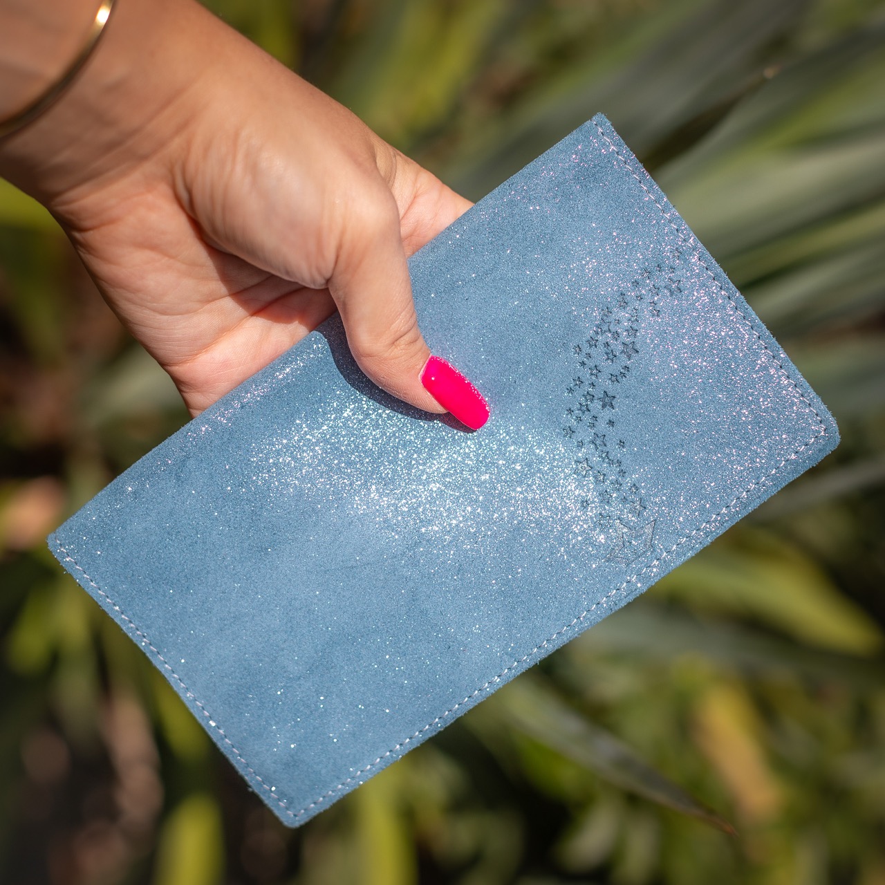 Le Cuir Pailleté, c’est un Cuir de Bovin Velours avec une paillette incrustée à chaud. De ce fait, la paillette ne se disperse pas et reste sur le produit.