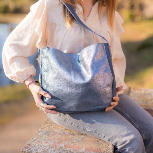 Nous vous le proposons dans notre traditionnel et incontournable Cuir Pailleté. L’anse ainsi que le fond du sac seront quant à eux en Cuir Grainé, un cuir de bovin pleine fleur. Le cuir Pailleté est un cuir de bovin velours sur lequel des paillettes sont incrustées à chaud. Ainsi, les paillettes restent sur le produit et ne se dispersent pas.